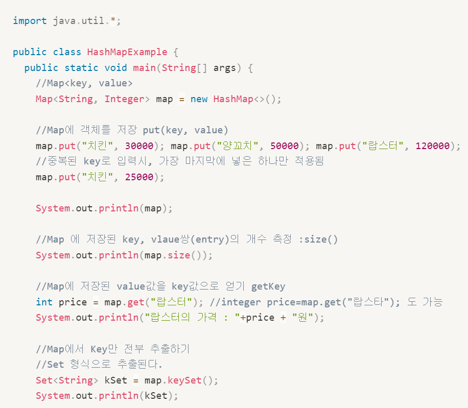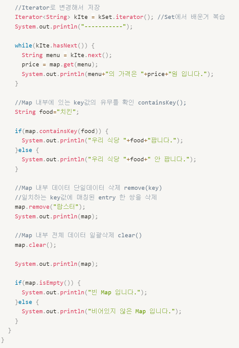 - keySet(): 저장된 모든 키를 Set객체에 담아서 리턴.