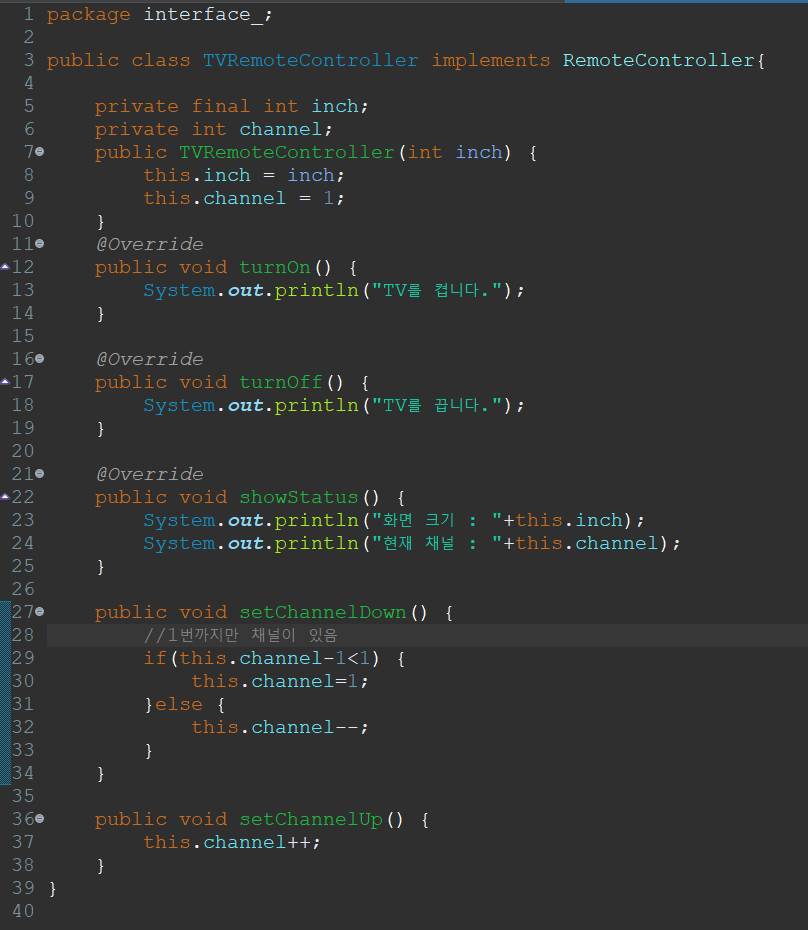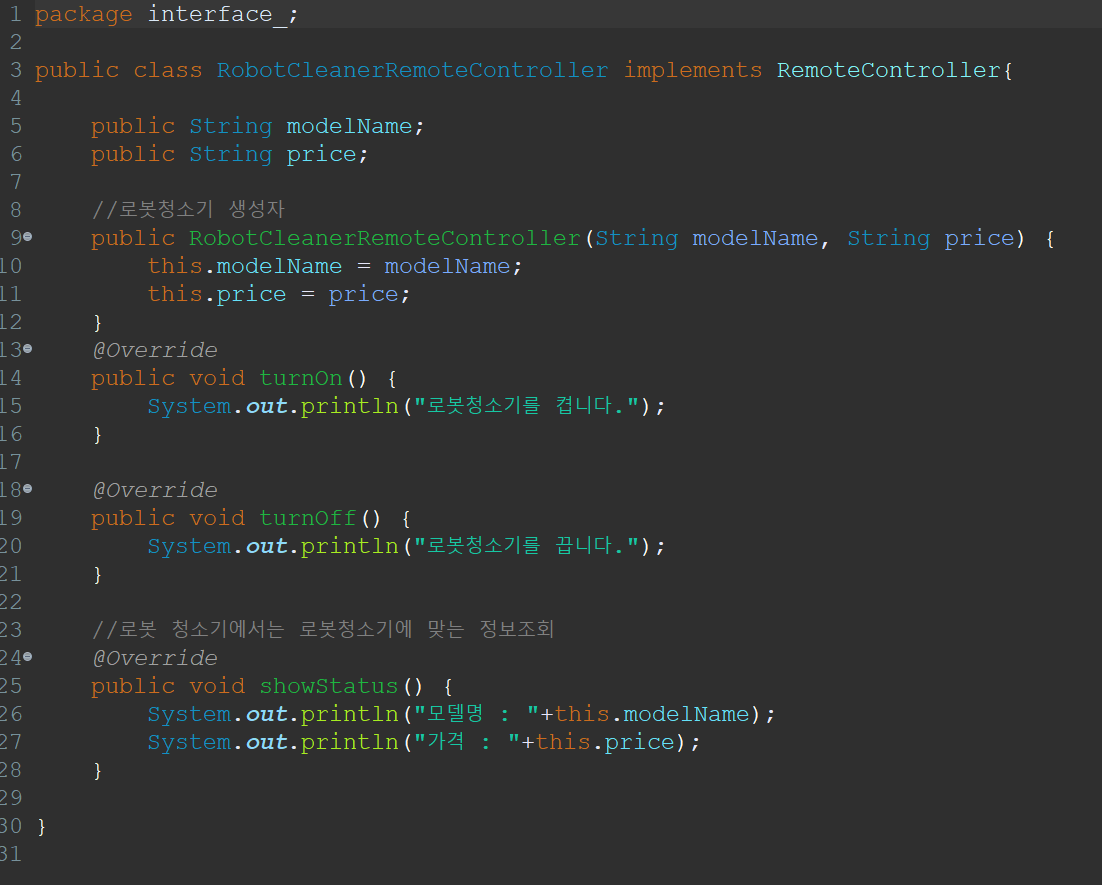 : implements 키워드를 사용해 클래스에서 인터페이스를 구현한다. 여러 인터페이스를 동시에 구현하는 것도 가능하다.