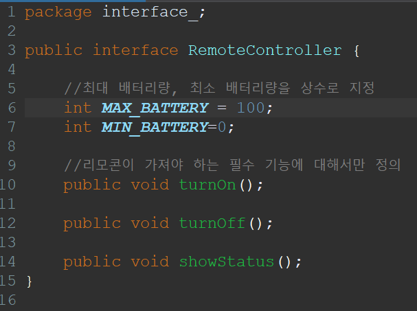 : interface 키워드를 사용해 선언. 추상메서드, 상수, 디폴트메서드, 정적메서드등을 가질 수 있다.