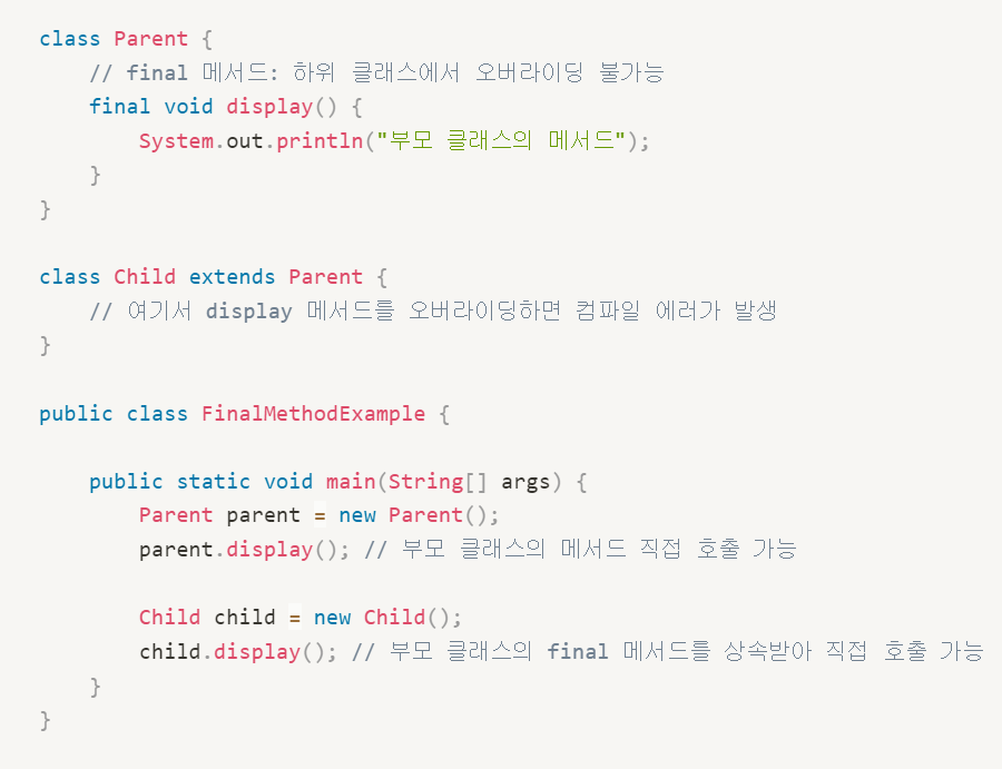 - final 메서드는 자식 클래스에서 부모 클래스의 메서드를 재정의하지 못하게 한다. (오버라이딩 불가능)