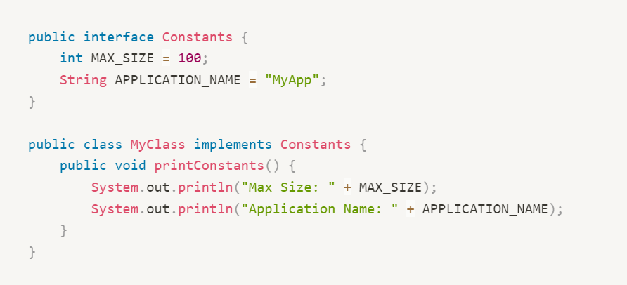 - 상수는 객체마다 저장할 필요가 없는 공용성을 가져야 하며, 여러가지 값으로 초기화될 수 없기 때문에 static과 final 제한자를 동시에 붙여 선언한다.