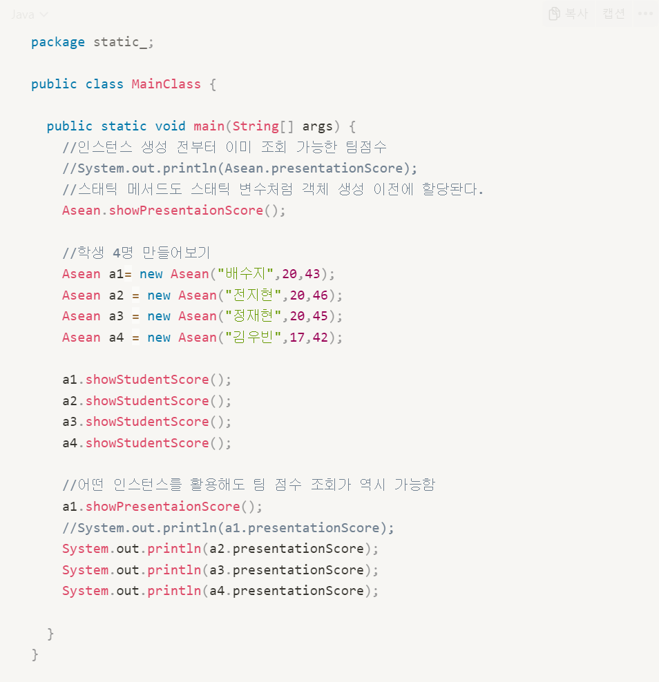 - 인스턴스 변수가 객체마다 독립적인 반면, 정적 변수는 모든 객체에서 동일한 값을 가진다.