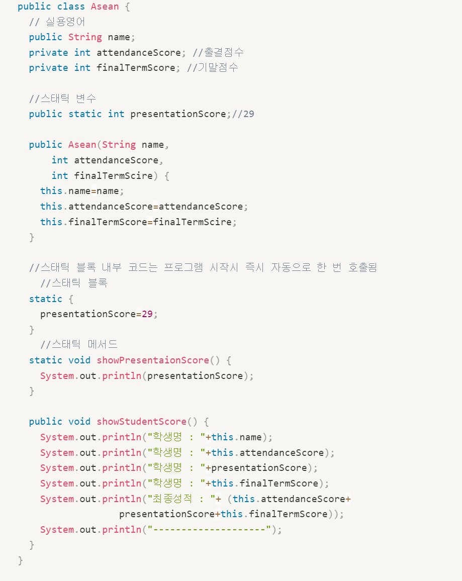 - 정적 초기화 블록은 static 변수들의 초기화에 사용한다. 일반 멤버변수는 생성자에서 초기화하지만 static 변수는 객체 생성 없이도 사용해야하므로 생성자를 통해 초기화할 수 없다.